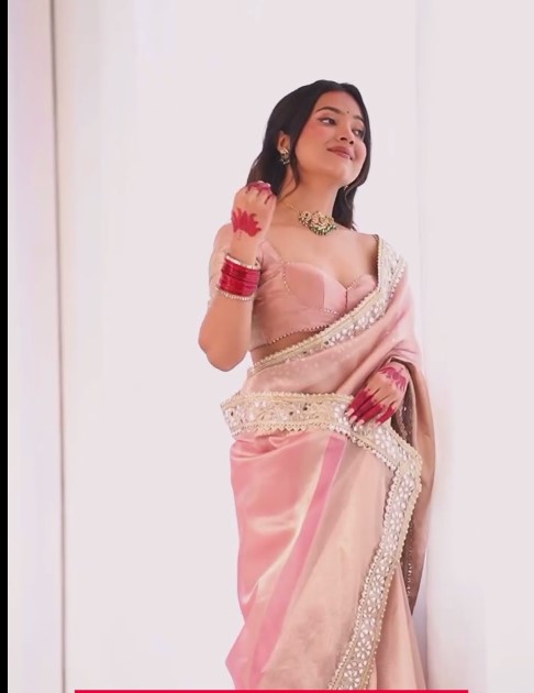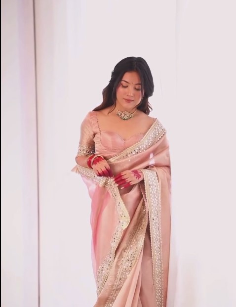 Exude timeless grace with this Blush Pink Satin Saree featuring a beautifully hand-embellished border. Crafted from luxurious satin silk, it drapes elegantly to enhance your natural silhouette. The soft blush tone paired with intricate mirror and zari detailing adds a subtle touch of glamour, perfect for bridesmaids, receptions, or festive evenings.