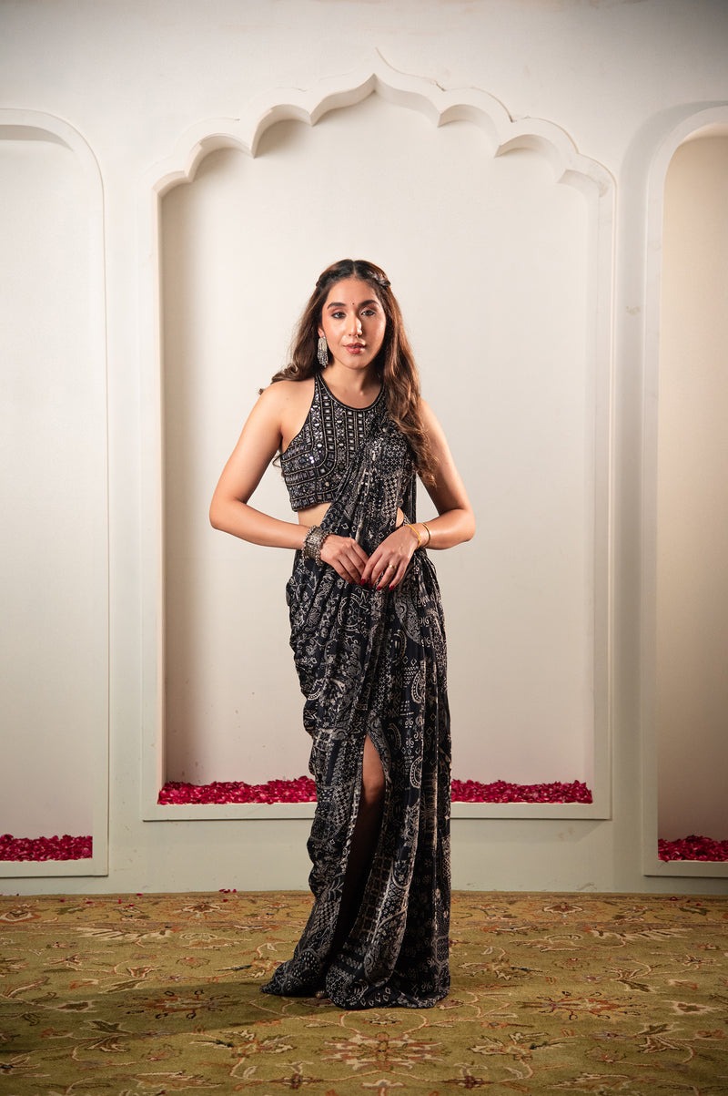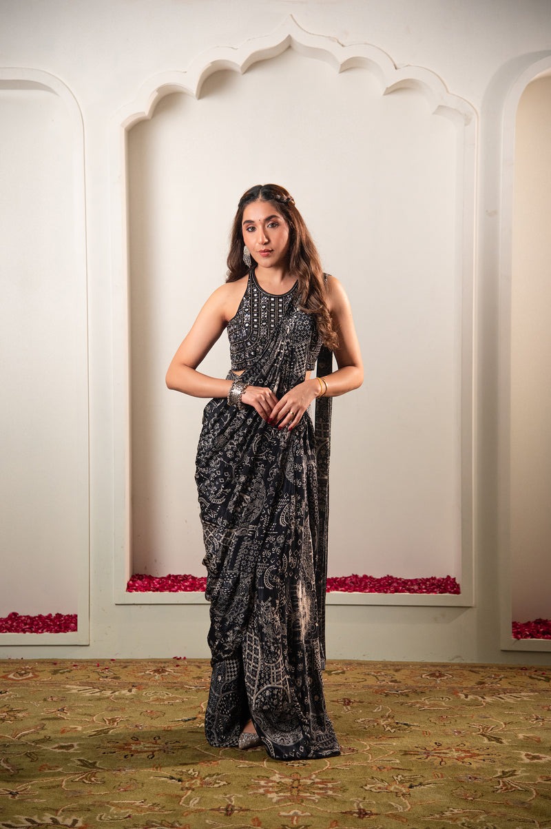 Drape yourself in instant sophistication with this striking Designer Black Chiffon Cocktail Saree. The lightweight fabric flows beautifully, featuring a captivating all-over printed body that offers subtle, textural depth. The true statement is the intricately stitched stonework blouse, which catches the light with a glamorous sparkle. Perfect for any evening event, this ensemble seamlessly blends traditional drape with modern, ready-to-wear flair, making it the ideal choice for a memorable cocktail party.