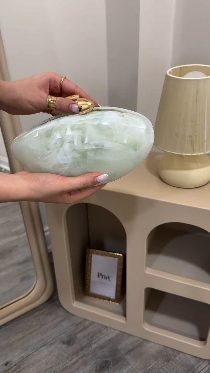 This elegant clutch bag is designed to make a refined statement. Crafted with a smooth pearl-effect exterior, it is highlighted by a striking gold-tone curved accent on the front, adding a contemporary and luxurious touch. The structured silhouette offers a sleek look while maintaining enough space for essentials such as a phone, cards, and cosmetics.