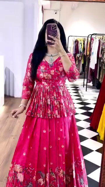 Step into elegance with this stunning pink floral lehenga set, designed for the modern woman who embraces traditional charm. This three-piece ensemble includes a vibrant floral-printed lehenga, a matching blouse (choli), and a soft baby pink dupatta adorned with delicate embellishments. Perfect for festive occasions and weddings, this outfit combines comfort with contemporary ethnic fashion.