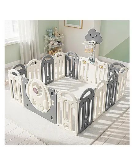 A spacious, modular baby playpen featuring secure locking panels, an easy-access safety gate, and child-friendly activity elements for safe indoor play.