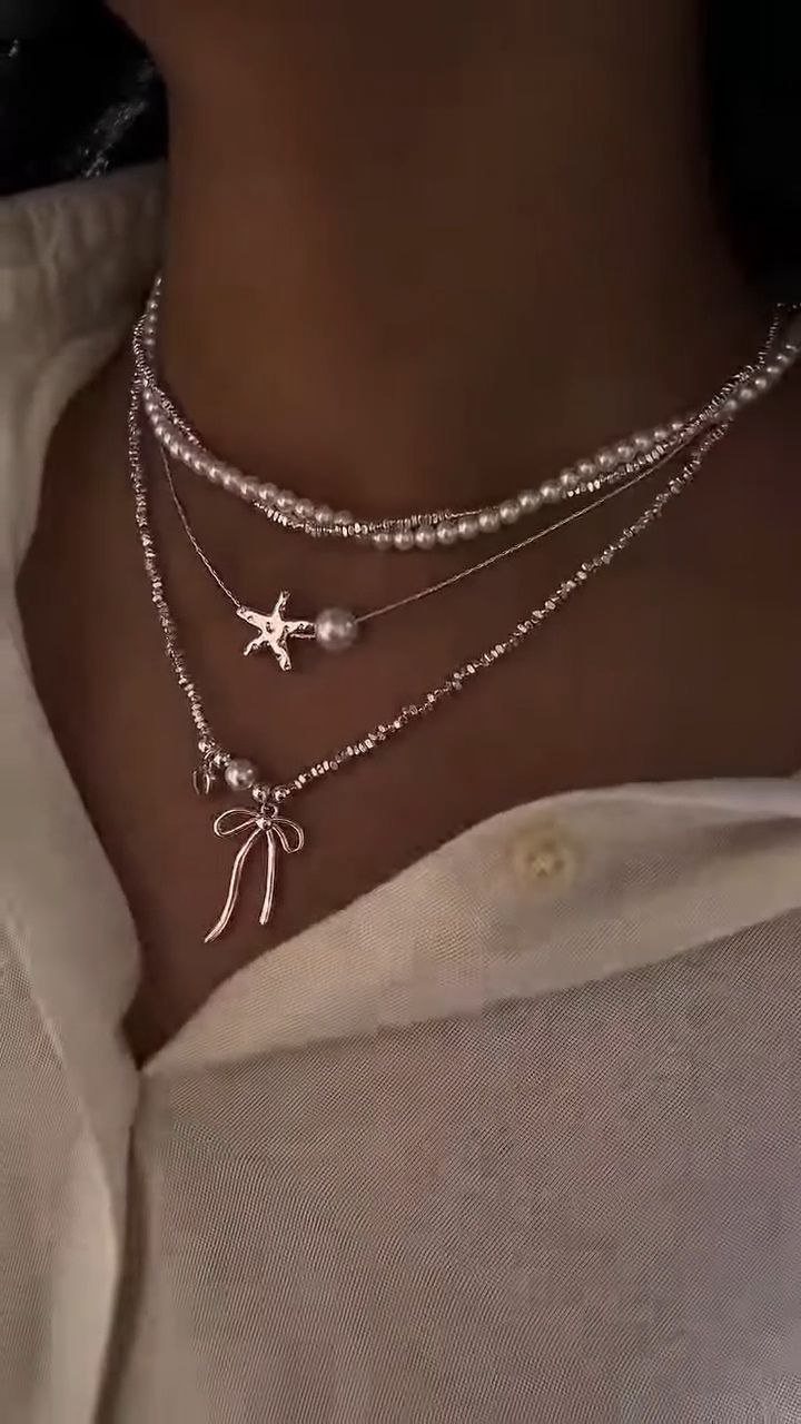 This layered necklace blends timeless elegance with modern charm. Designed with multiple fine chains, it features luminous pearl details, a minimalist star accent, and a graceful bow charm that adds a soft, romantic finish. The combination of textures and lengths creates a naturally layered look that sits beautifully along the neckline. Perfect for elevating everyday outfits or adding a subtle statement to evening wear, this necklace offers versatility, femininity, and understated sophistication.