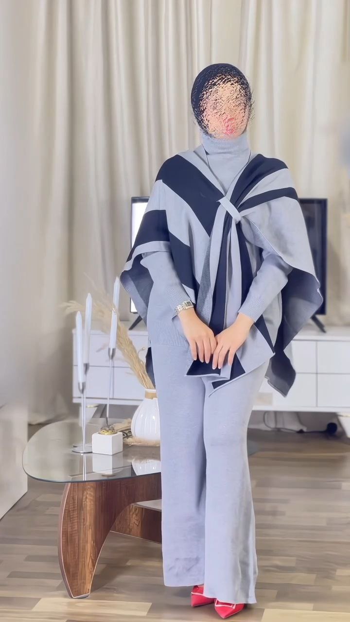 Elegant two-piece modest co-ord set featuring a relaxed-fit knit top and wide-leg pants, paired with a detachable contrast shawl overlay. Designed for comfort with a refined, contemporary silhouette.