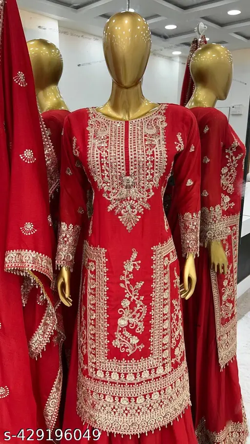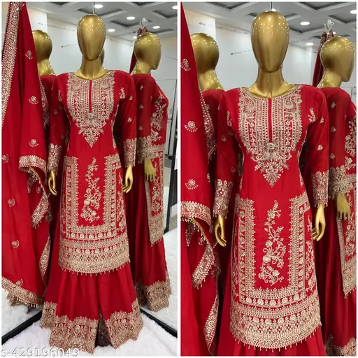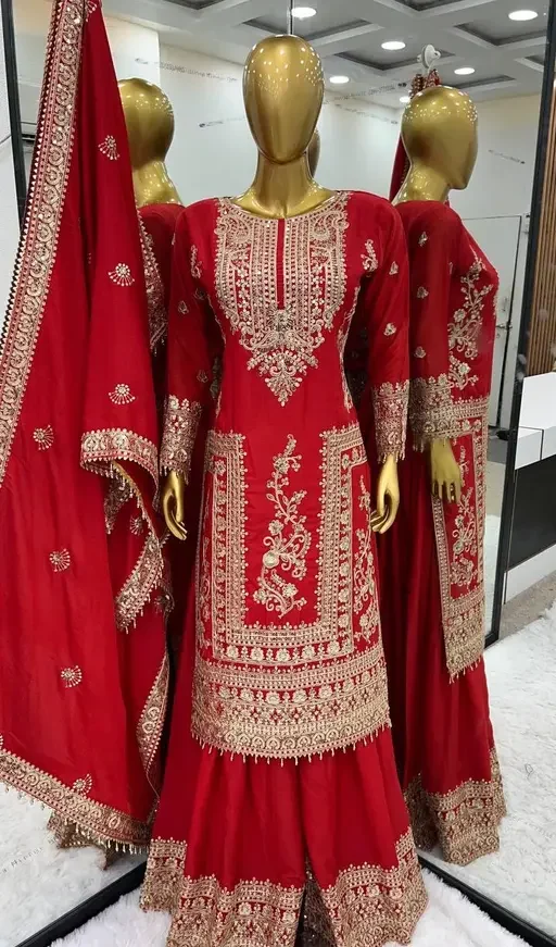 New Grand Red Color Chinnon Embroidery Sequence Sharara Suit
