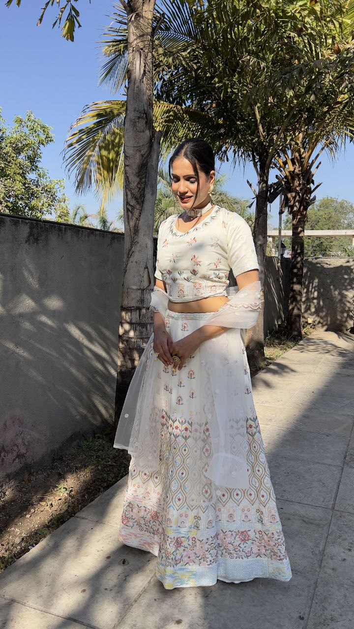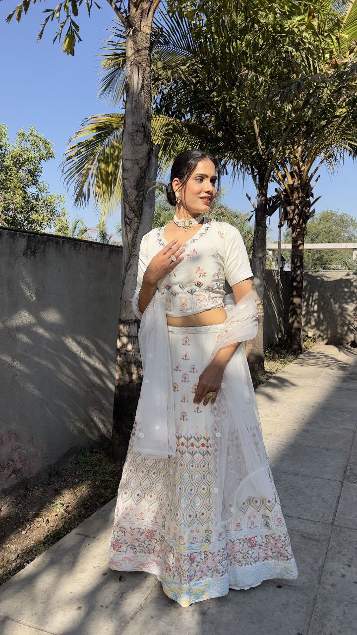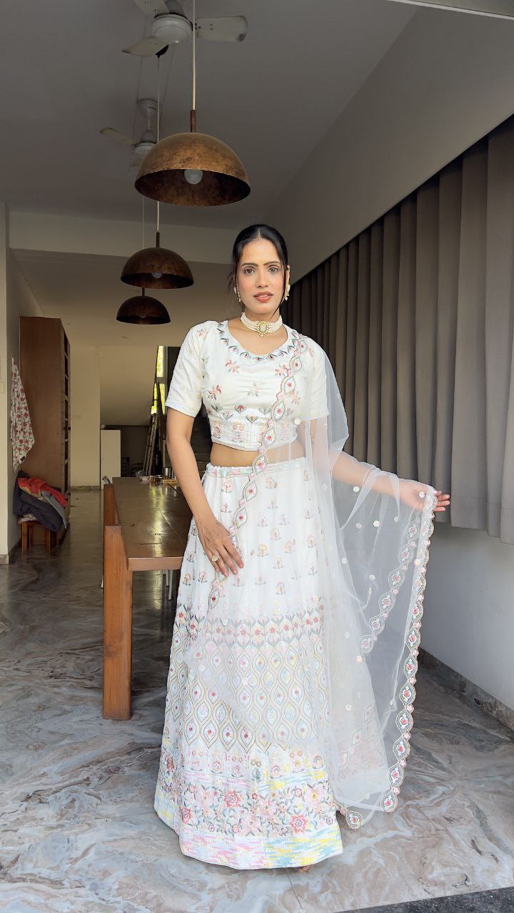 White Color Thread Embroidery Work Georgette Lehenga Choli